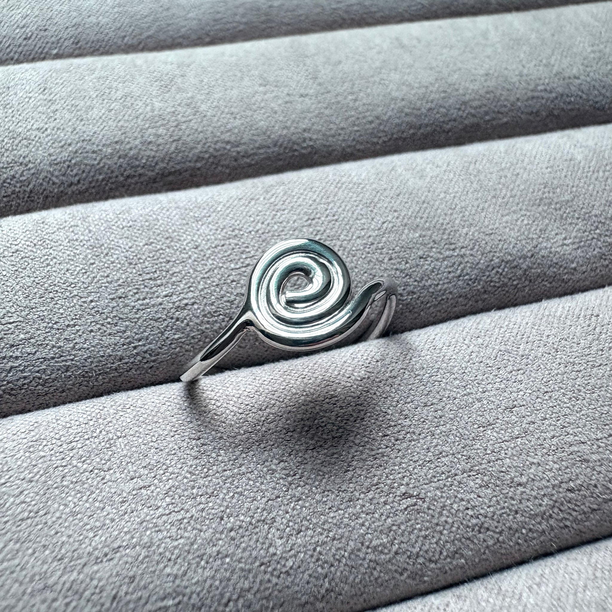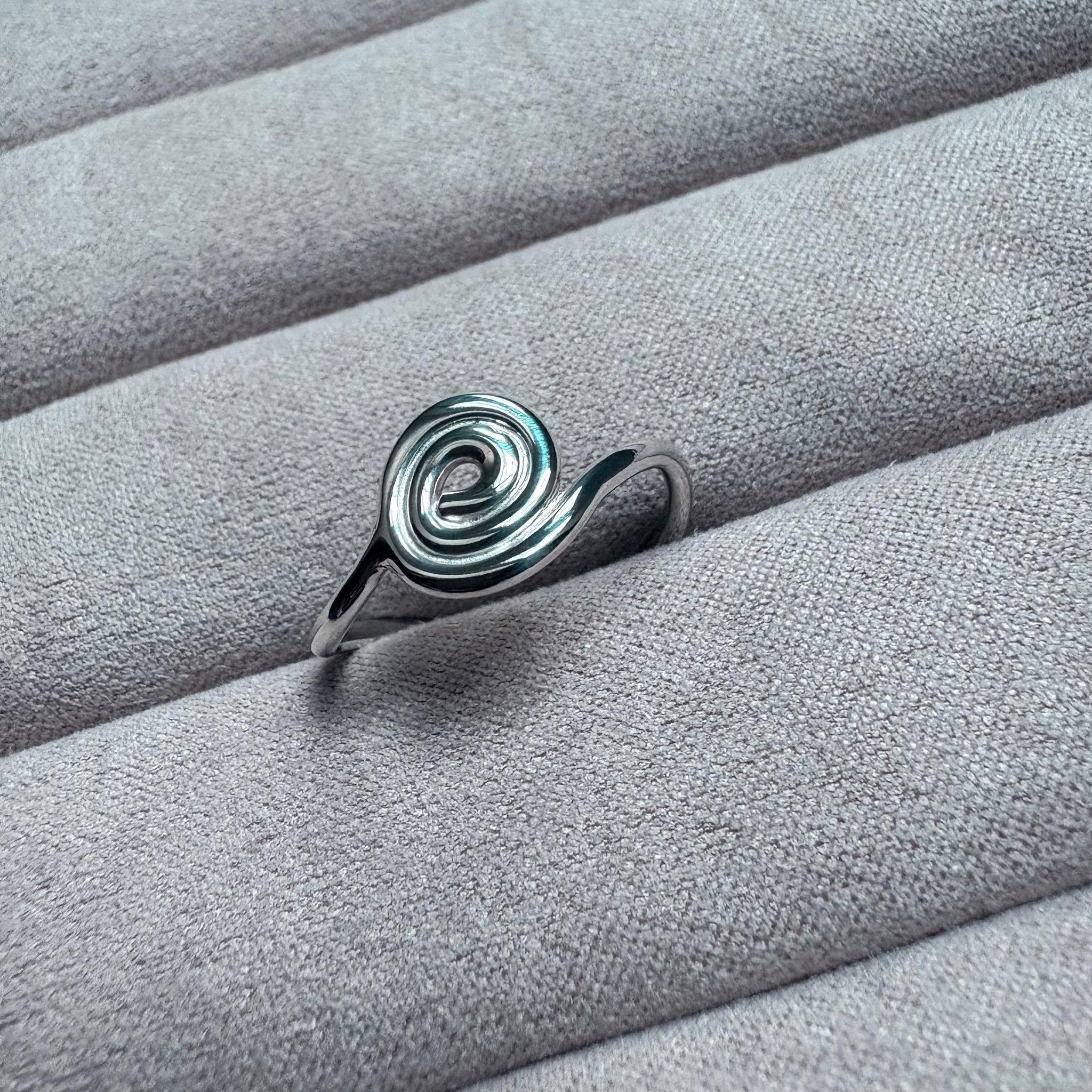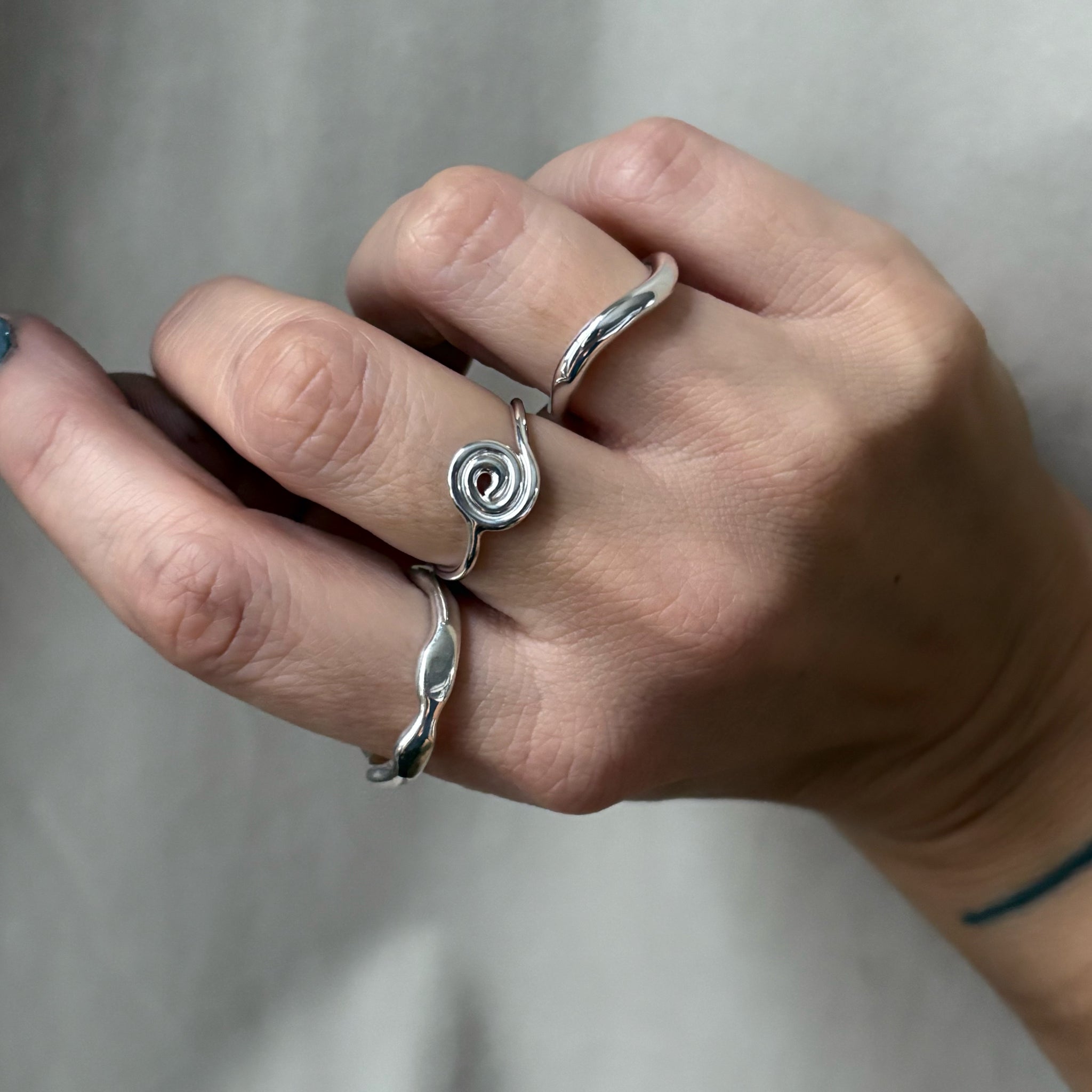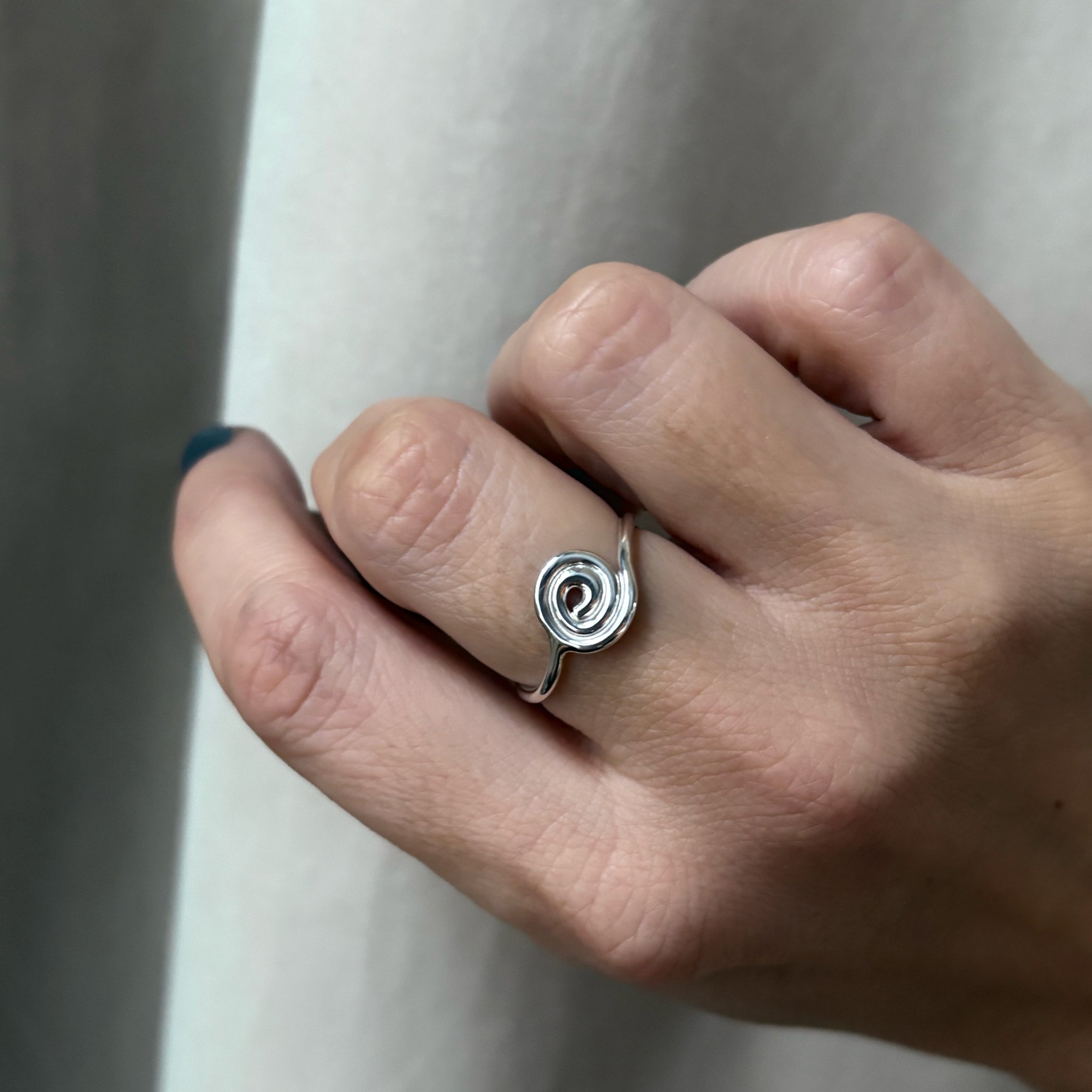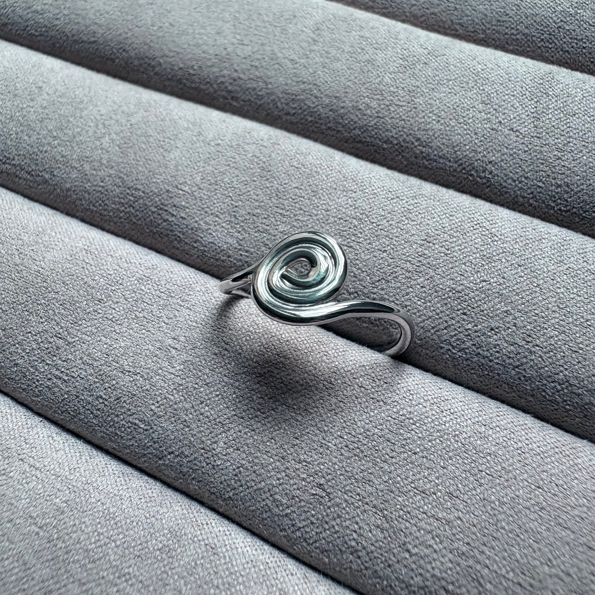 Smuk ring med en snoning formet i hånden, og en organisk for i ringskinnen. Ringen leder tankerne hen på et naturligt element, dog med enkeltheden og det stramme look i fokus.